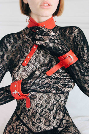 This bold red neck harness exudes an exotic allure, blending sensuality with daring elegance. Crafted with adjustable straps and silver accents, it’s designed for bold statements. Perfect for pairing with lingerie or playful moments, this piece adds an adventurous touch to your collection.